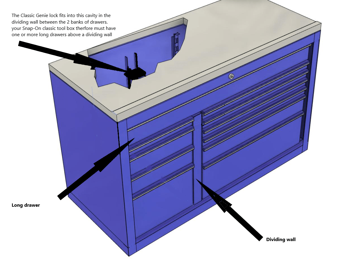 Genie-Lock for Classic Models. Simply Slots into the Cavity created by the dividing wall below the long drawers